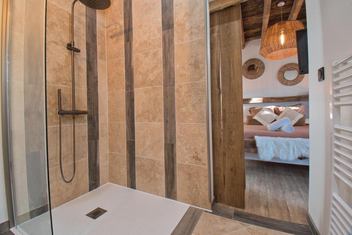 Chambre Lit King-Size - Vue sur Jardin. The well-equipped kitchen features a stovetop, a refrigerator, kitchenware and an oven. The double room provides a dining area, a wardrobe, a terrace with garden views as well as a private bathroom featuring a shower. The unit offers 1 bed.