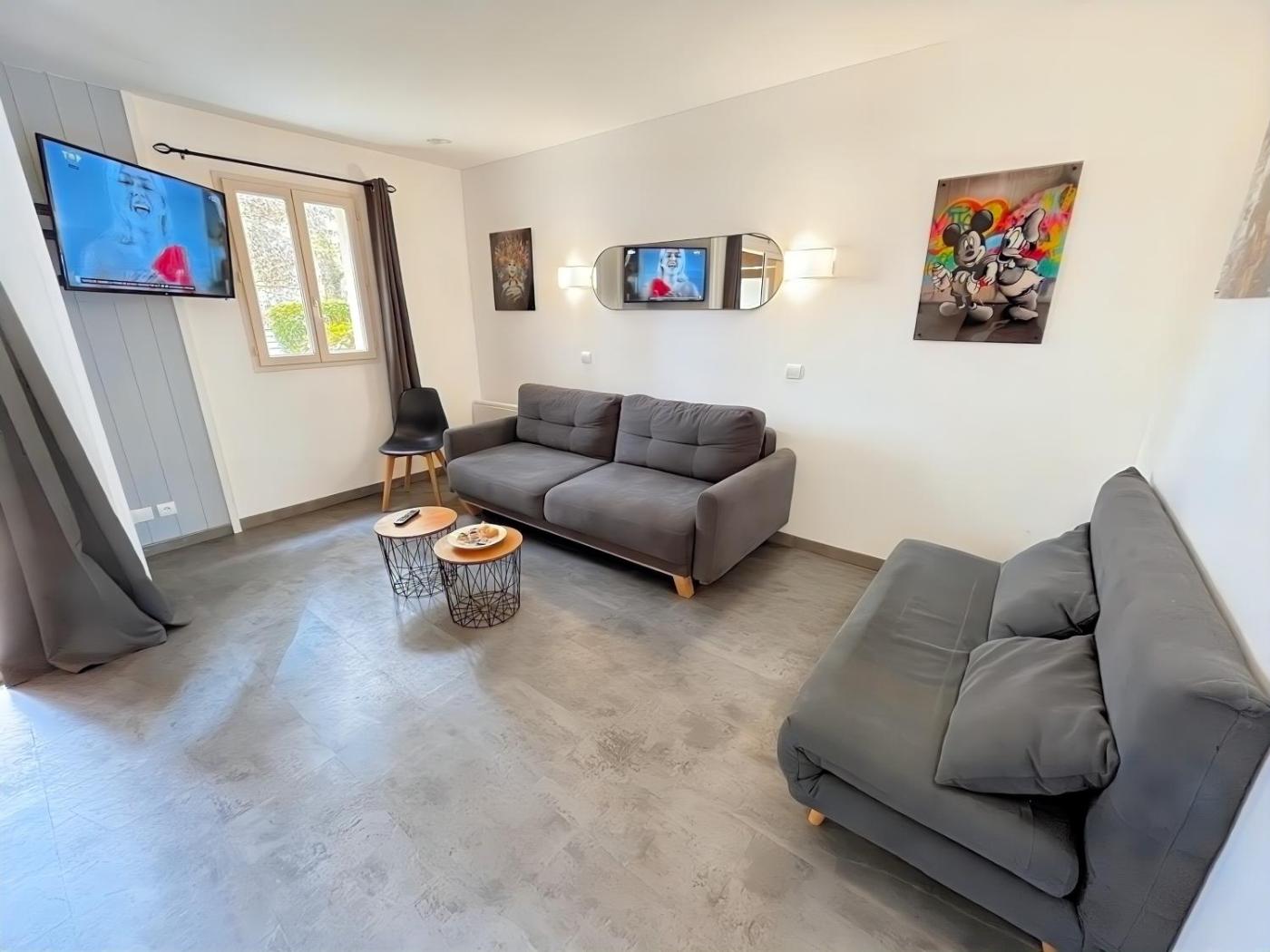 Appartement 2 Chambres - Vue sur Jardin. This apartment offers a private pool. This apartment is comprised of 1 living room, 2 separate bedrooms and 2 bathrooms with a bath or a shower and a hairdryer. Guests can make meals in the kitchenette that comes with a stovetop, a refrigerator, a dishwasher and kitchenware. This apartment features a coffee machine, heating, a flat-screen TV and a terrace. The unit offers 3 beds.