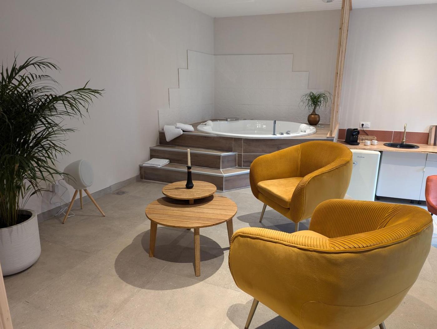 Chambre Double avec Baignoire Spa. This double rooms special features are the hot tub and the spa bath. The fully equipped kitchen features a stovetop, a refrigerator, kitchenware and an oven. The spacious double room provides soundproof walls, a tea and coffee maker, a terrace with ancourtyard view as well as a private bathroom featuring a walk-in shower. The unit offers 2 beds.