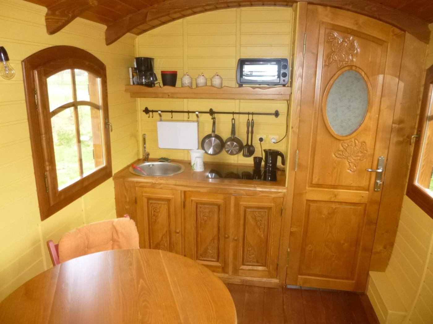 Roulotte (2 Adultes + 2 Enfants). Offering a terrace with BBQ, this traditional wooden caravan is situated within the countryside and the bedroom isin a wooden alcove. It features an equipped kitchenette and a walk-in shower. This mobile home can accommodate 2 extra beds for children.
