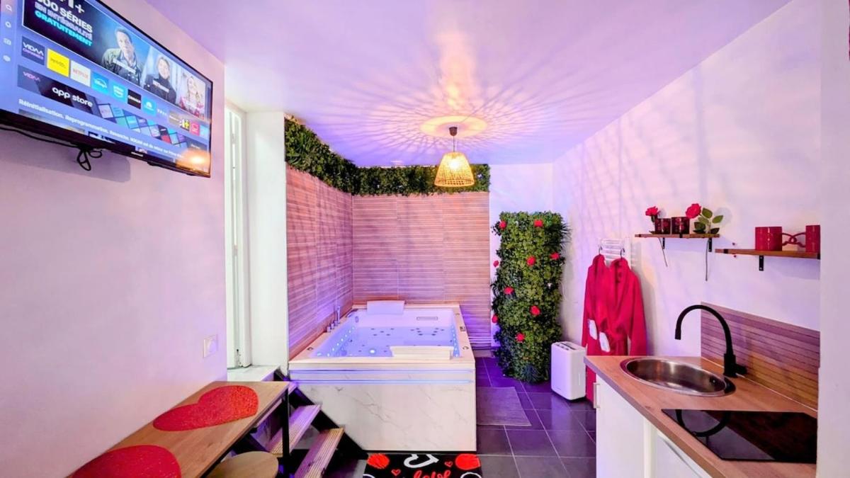 Studio avec Lit King-Size. This luxurious apartment features a hot tub, a spa bath and a sauna. Featuring a private entrance, this apartment consists of a kitchenette, 1 bedroom and 1 bathroom with a shower and slippers. In the well-equipped kitchenette, guests will find a stovetop, a refrigerator, kitchenware and a microwave. The apartment provides a flat-screen TV with streaming services, a coffee machine, a dining area and heating. The unit offers 1 bed.