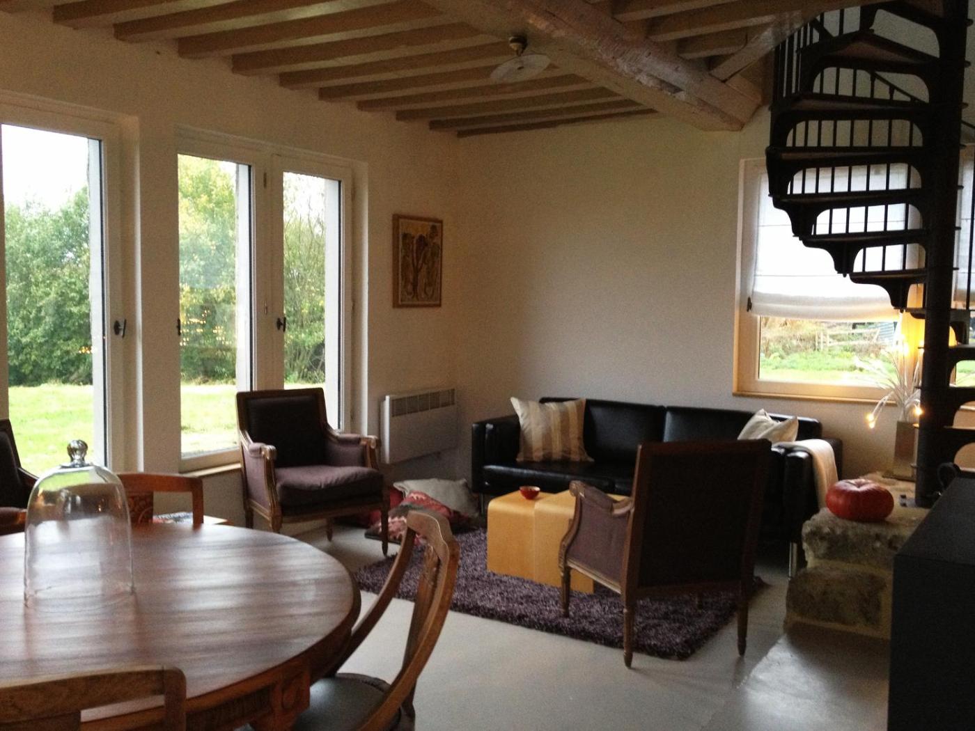 Maison 3 Chambres. Offering views of the Monne Valley, this 2-level Norman inspired cottage accommodates 6 people. Guests can prepare meals in the open-plan kitchen or relax in the lounge which features a Stovax wood stove, original wooden beams and stone walls. On the first floor there are 2 double bedrooms; the Walnut room with an en-suite shower and the Monne room which includes a queen-sized bed. The third bedroom is a landing room with 2 single beds. There is also a separate bathroom complete with shower and bath. Towels are provided.