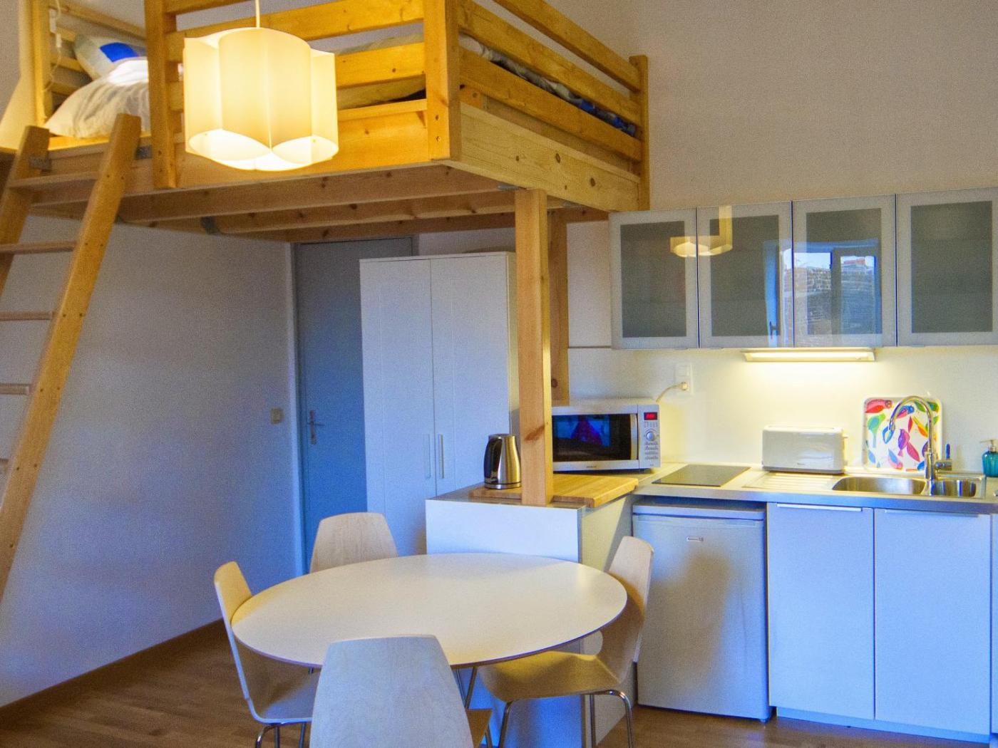 Studio. This apartment has a stovetop, washing machine and toaster. The apartment is located on the 3rd floor without a lift.