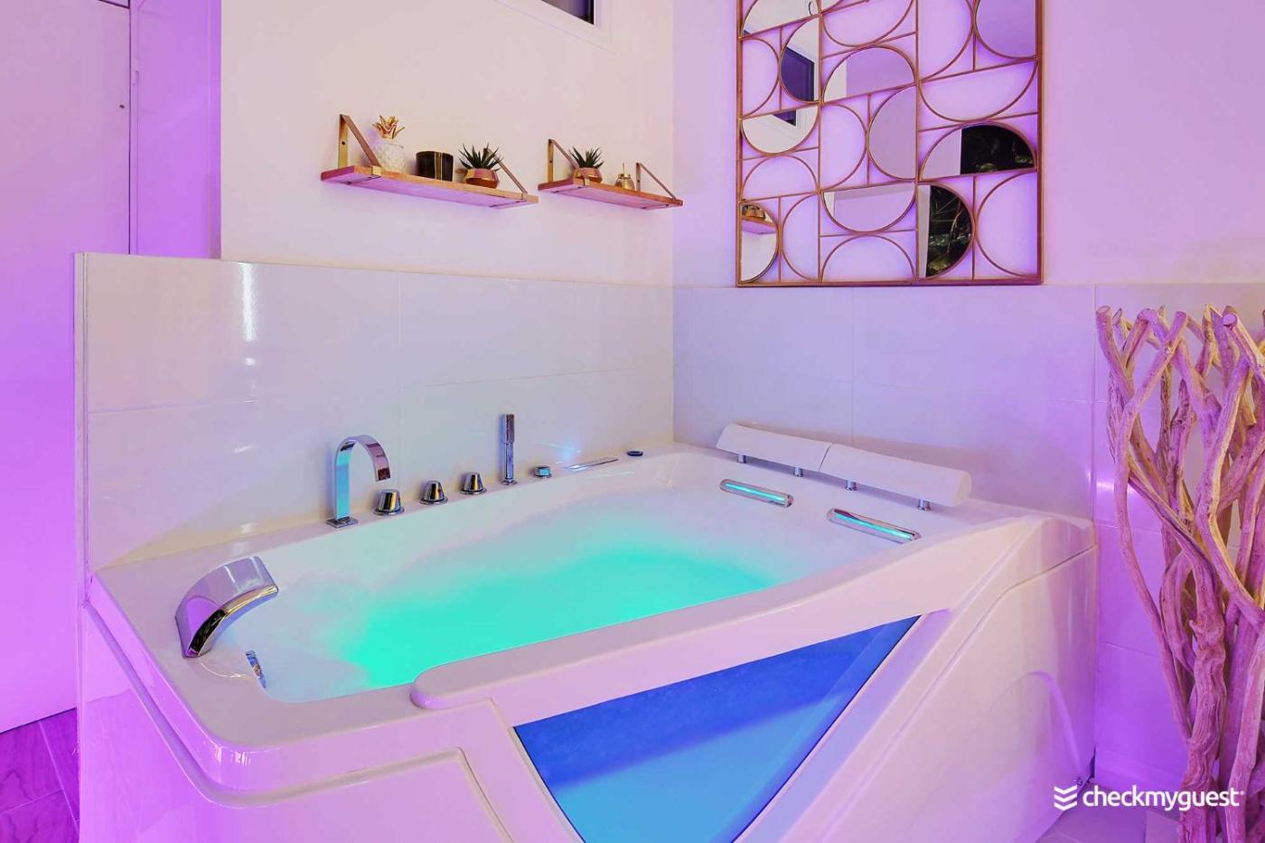 Appartement. This apartments standout feature is the hot tub. The apartment includes a private bathroom fitted with a hairdryer. Guests can make meals in the kitchen that has a stovetop, a refrigerator, kitchenware and a microwave. The apartment offers a TV with cable channels, a private entrance, a tea and coffee maker, heating as well as city views. The unit has 1 bed.