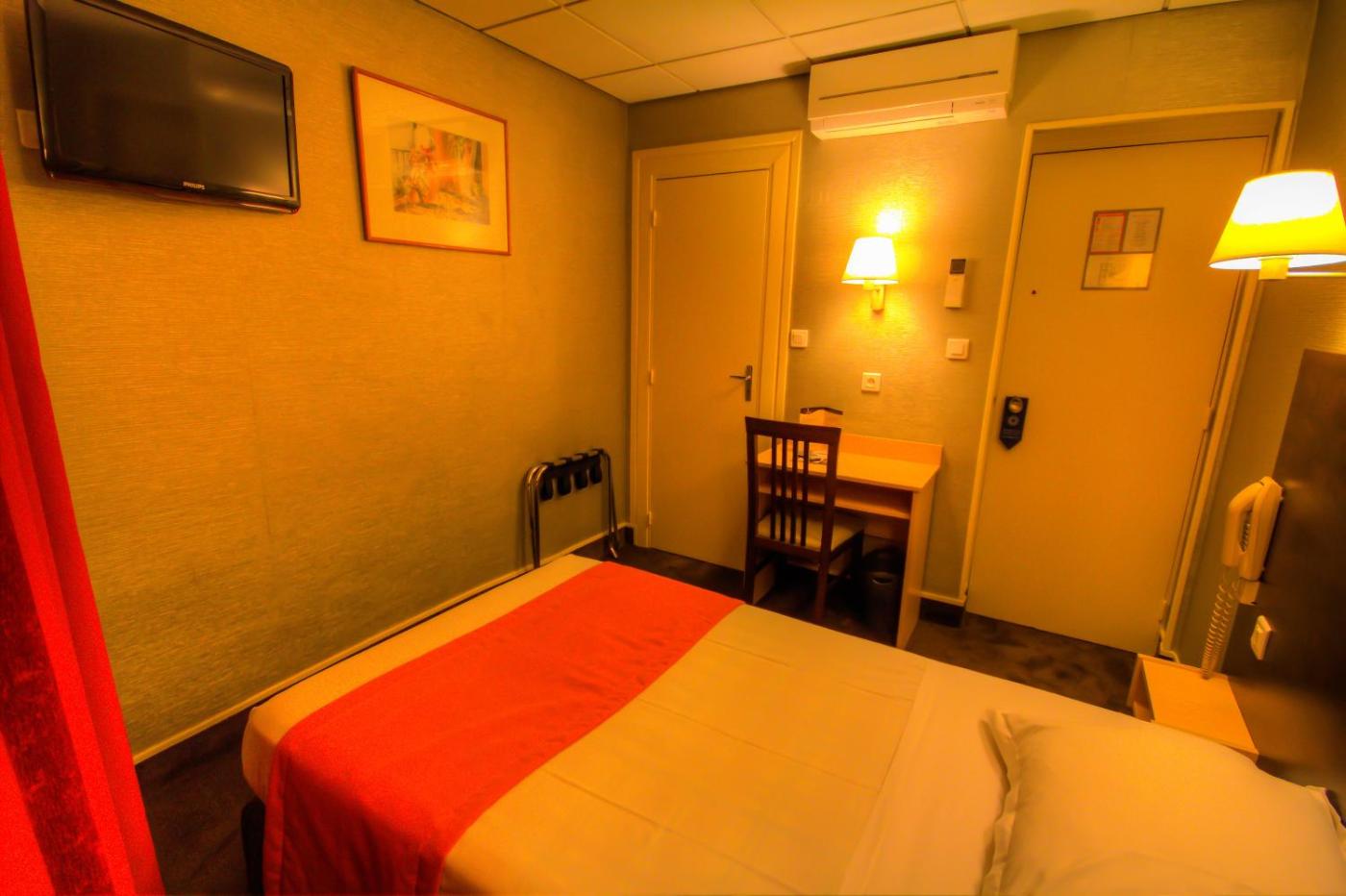 Les chambres climatisées de lhôtel des Trois Gares disposent dune télévision par satellite. Décorées dans des tons rouges, elles sont également dotées dun téléphone et dune salle de bains privative.