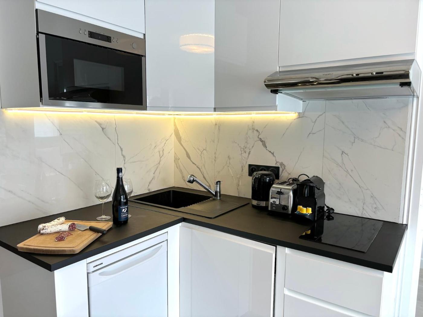 Appartement 1 Chambre. This apartment is comprised of 1 living room, 1 separate bedroom and 1 bathroom with a bath and a shower. The fully equipped kitchen features a stovetop, a refrigerator, kitchenware and a microwave. The apartment offers a tea and coffee maker, a seating area, a dining area, a wardrobe, as well as a flat-screen TV with cable channels. The unit offers 2 beds.