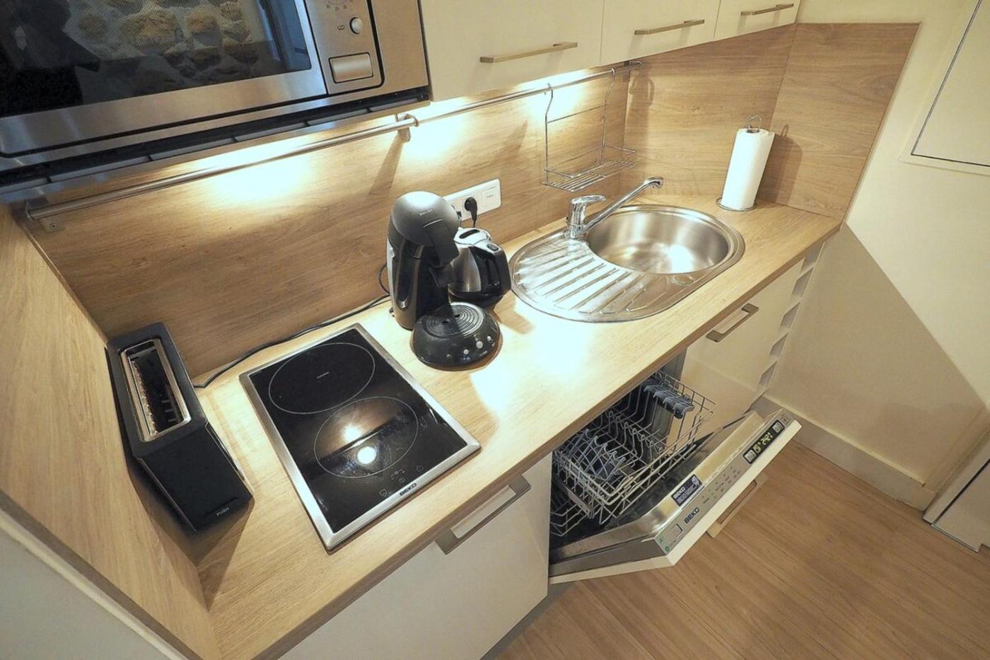 La cuisine de lappartement est équipée dustensiles, dune cuisinière et dun lave-vaisselle. Un réfrigérateur, une machine à café et un grille-pain sont également fournis.