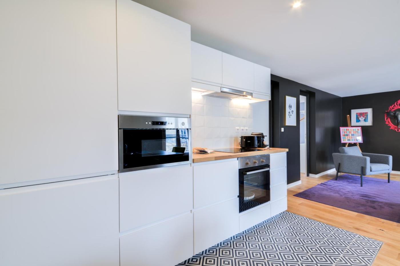 Appartement 1 Chambre. Cet appartement comprend un salon et 1 chambre séparée. La salle de bains est pourvue d’une douche et d’articles de toilette gratuits. Vous pourrez préparer vos repas dans la cuisine équipée de plaques de cuisson, d’un four, d’un réfrigérateur et d’ustensiles. Revêtu de parquet, cet appartement dispose dun coin salon avec une télévision par câble à écran plat, dun lave-linge, dune machine à café et dun coin repas. Ce logement comprend 2 lits.